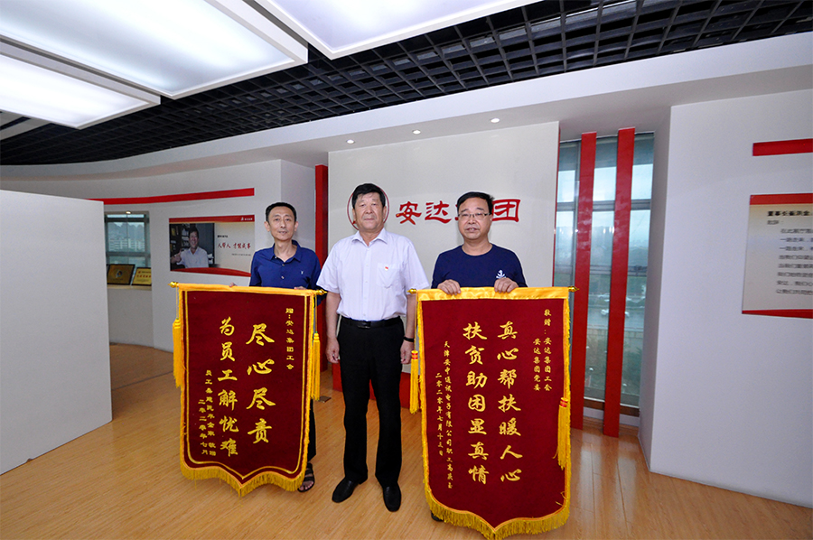 24日2020-088月24日,鴻達精工機械有限公司職工桑建民、安中通訊電子有限公司職工高慶玉,作為困難職工代表來到安達集團,分別將繡有“真心幫扶暖人心,扶貧助困顯真情”,“盡心盡責,為員工解憂難”的錦旗送到了安達集團黨委書記、董事長崔洪金,工會主席鄭寶彥的手中,感謝安達黨委、工會對他們的真心關懷和幫助。 近...[查看詳情]