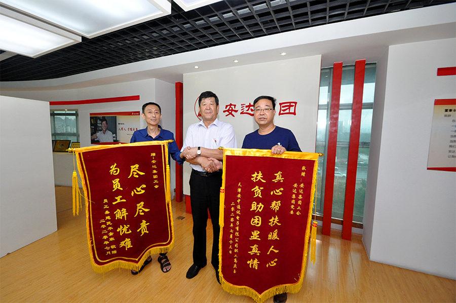 8月24日,鴻達(dá)精工機(jī)械有限公司職工桑建民、安中通訊電子有限公司職工高慶玉,作為困難職工代表來到安達(dá)集團(tuán),分別將繡有“真心幫扶暖人心,扶貧助困顯真情”,“盡心盡責(zé),為員工解憂難”的錦旗送到了安達(dá)集團(tuán)黨委書記、董事長崔洪金,工會主席鄭寶彥的手中,感謝安達(dá)黨委、工會對他們的真心關(guān)懷和幫助。