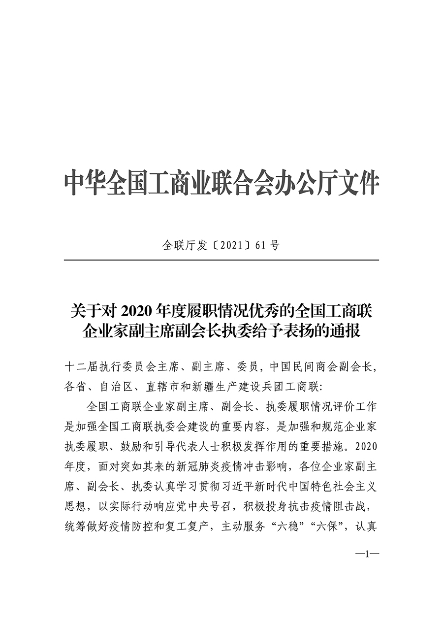 近日,全國工商聯發布《關于對2020年度履職情況優秀的全國工商聯企業家副主席副會長執委給予表揚的通報》。《通報》指出,2020年度面對突如其來的新冠肺炎疫情沖擊影響,各位企業家副主席、副會長、執委認真學習貫徹習近平新時代中國特色社會主義思想,以實際行動響應中央號召,積極投身抗擊疫情狙擊戰,統籌做好疫情防控和復工復產,主要服務“六穩”“六保”,認真貫徹新發展理念,積極參與構建新發展格局,持續參與“萬企幫萬村”行動,為取得抗擊新冠肺炎疫情斗爭重大勝利、如期取得脫貧攻堅戰全面勝利、推動高質量發展作出了積極貢獻。按照《關于做好2020年度全國工商聯企業家副主席副會長執委履職情況評價工作的通知》要求,全國工商聯對企業家、副主席、副會長、執委2020年度履職情況開展了評價工作。經全國工商聯主席辦公室會議、黨組會議審議,決定對葉青等6名企業家副主席、副會長,丁佐宏等77名企業家執委予以通報表揚。