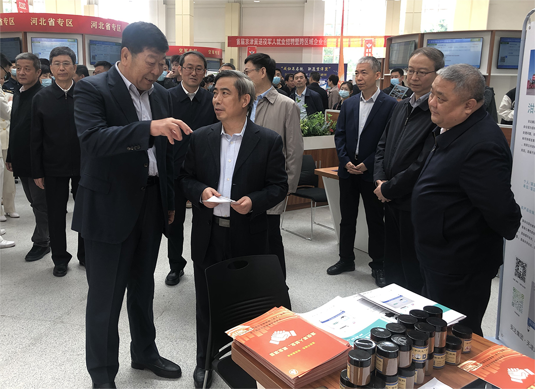 市退役軍人事務局局長孫宏波等領導與崔洪金董事長在展區(qū)交流