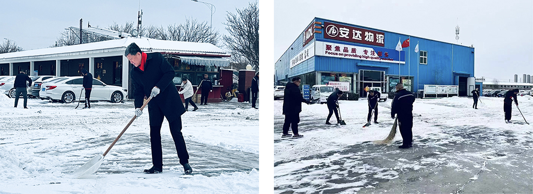 20日-21日晨,受大范圍寒潮影響,我市大部分地區出現中到大雪,翩然而至的龍年第一場春雪為春節期間的城市平添了幾分浪漫與詩意,但雪景雖美,也為人們的出行和工作帶來諸多不便。為保障員工們安全出行,21日一大早,安達集團本部及各子公司廠院內,各單位員工在相關領導帶領下,手拿鐵鍬、掃帚、簸箕等工具,對辦公樓門前區域和廠區內重要作業點位開展積雪大清掃活動。瑟瑟寒風,“斷崖式”降溫,無不顯示著倒春寒的“威力”,安達人不畏嚴寒,“浴”雪奮戰,大家擰成一股繩,全力除雪,用行動完美詮釋著“團結就是力量”。
