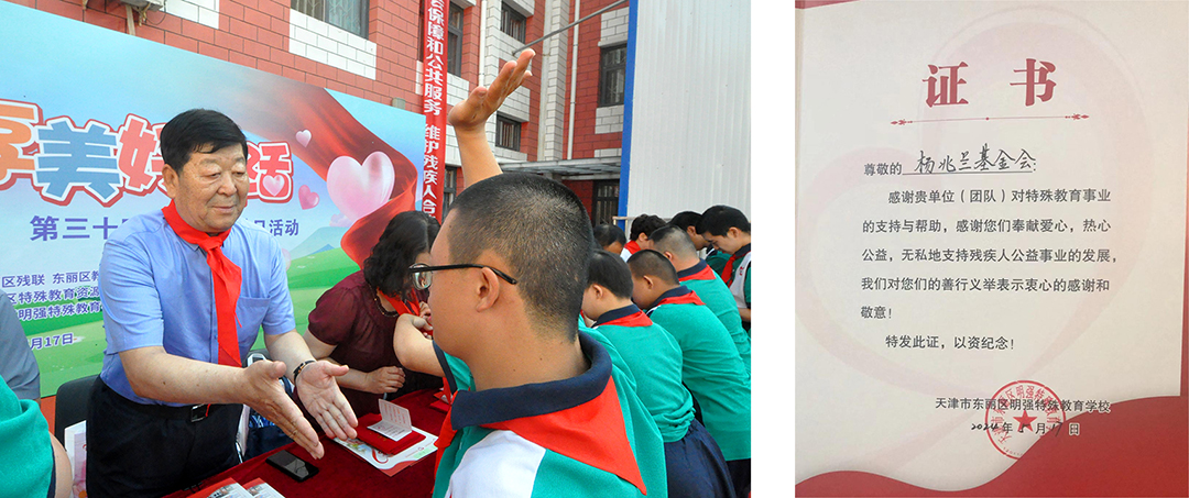 表彰會議在雄壯的國歌聲后隆重開始,少先隊員代表為各位參會領導、來賓敬獻紅領巾,孩子們用特殊的方式表達了對各位領導和來賓的尊敬愛戴與熱情歡迎。接著,吳會新校長代表學校致感謝詞,向一直以來關心、支持學校發展的企事業單位和社會愛心人士表達了誠摯的謝意。“扶殘助困,善舉濟世,關愛生命,回報社會,推動天津市慈善事業發展”是天津市楊兆蘭慈善基金會發展的宗旨,自基金會成立以來,已向東麗區民強特教學校捐款100余萬元,用于支持本區特殊教育事業。在本次活動的頒獎環節,民強學校吳會新校長特別向安達集團代表頒發證書,以示楊兆蘭慈善基金會多年來對特殊教育事業的支持與感謝。