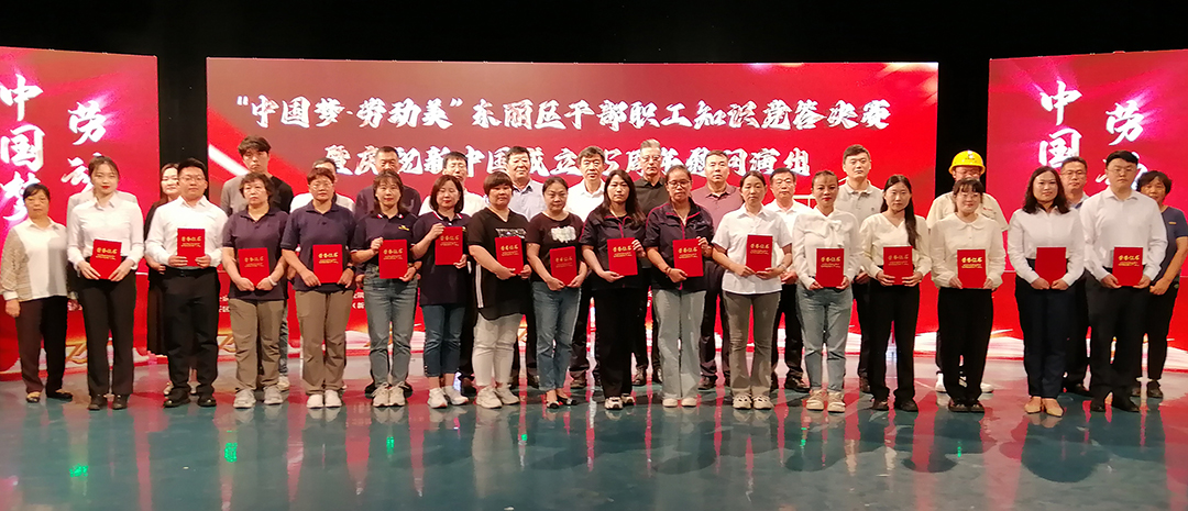 活動以歌伴舞《時代號子》開場,唱出了東麗職工的豪情和壯志,唱響勞動最偉大、勞動最光榮。隨后,天津金隅混凝土有限公司工會等8支代表隊,進行黨的創新理論知識競答,最后在頒獎環節,崔洪金為獲得銅獎選手頒發證書,并合影留念。