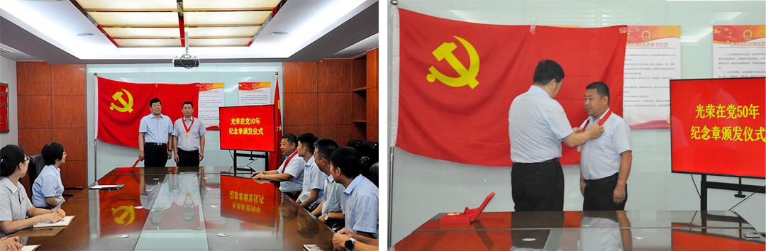 七一當天,集團本部舉行了莊重而溫馨的 “光榮在黨 50 年” 紀念章頒發(fā)儀式。集團黨委書記、董事長崔洪金親自為一支部老黨員黃柏燁、孔令奇頒發(fā)紀念章。因路途遙遠未能到場,由支部黨員代為領(lǐng)取。崔洪金書記表示,兩位老黨員 50 年如一日堅守初心、忠誠于黨,是集團全體黨員學習的榜樣,希望大家以他們?yōu)闃藯U,傳承紅色精神,立足崗位擔當作為。