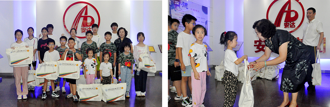 自由活動期間,安達集團工作人員帶領孩子們參觀企業產業展廳和文化展廳。通過參觀,孩子們進一步感受安達集團的文化底蘊與創新精神,對父母所在企業的認同感愈發濃厚。為鼓勵孩子們的愛心捐款、肯定他們的慈善之心,郝鳳榮理事長為每一位捐款的小朋友發放愛心禮包。