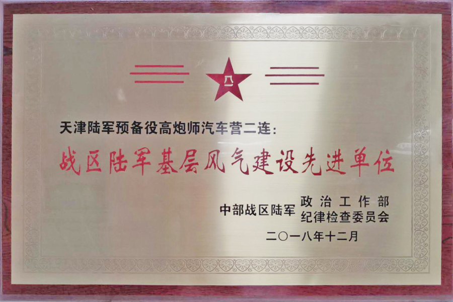 同時(shí),為表彰預(yù)備役高炮師汽車營二連日常刻苦訓(xùn)練,嚴(yán)肅風(fēng)紀(jì),積極承當(dāng)各項(xiàng)任務(wù)。中部戰(zhàn)區(qū)陸軍政治工作部、紀(jì)律檢查委員會(huì),特授予天津陸軍預(yù)備役汽車營二連“戰(zhàn)區(qū)陸軍基層風(fēng)氣建設(shè)先進(jìn)單位”稱號(hào)。