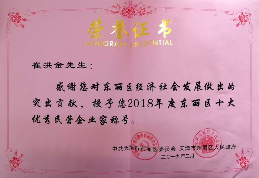 安達集團黨委書記、董事長崔洪金榮獲2018年度東麗區十大優秀民營企業家并頒發證書。